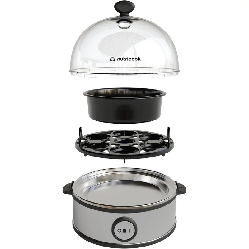 تخم مرغ پز نوتریکوک مدل NC-EC360 دستگاهی با طراحی ساده و زیبا به رنگ نقره ای، رومیزی، جمع و جور و سبک بوده که در عرض چند دقیقه تخم مرغ ها را می پزد. این تخم مرغ پز دارای 2 ظرف یکی با 7 جایگاه جهت آب پز کردن تخم مرغ و دیگری کاسه برای تهیه نیمرو و انواع املت می باشد. بدنه دستگاه از کیفیت ساخت خوبی برخوردار بوده از فلز و پلاستیک ساخته شده ایک درپوش شفاف با دریچه ای جهت خروج بخار برای این محصول در نظر گرفته شده که امکان مشاهده تخم مرغ ها حین پخت را فراهم می کند. سینی تخم مرغ با 7 جایگاه و کاسه و پیمانه از جنس پلاستیک بدون BFA و قابل شستشو در ماشین ظرفشویی هستند. طراحی جمع و جور و شیک این اجاق تخم مرغ، آن را به یک افزودنی عالی برای هر میز آشپزخانه تبدیل کرده است.
