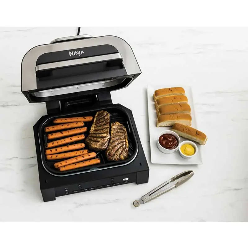 گریل نینجا مدل DG551 با طراحی زیبا و منحصر به فرد به رنگ استیل/خاکستری جلوه مدرنی به دکوراسیون آشپزخانه شما می بخشد. این دستگاه از نوع رومیزی و جمع و جور بوده که روی پیشخوان یا میز آشپزخانه فضای زیادی را اشغال نمی کند. صفحات این گریل از ظرفیت خوبی برای طبخ مواد غذایی برخوردار بوده و تا 6 استیک، حداکثر 24 هات داگ را می توان همزمان آماده کرد. همچنین در سینی پخت دستگاه می توان حجم زیادی سیب زمینی خلالی، قارچ خرد شده و غیره را سریع درست کرد.