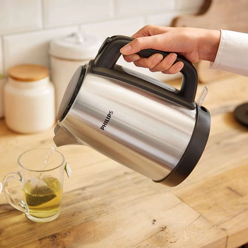 کتری برقی فیلیپس HD9350 دارای بدنه ای از جنس استیل ضد زنگ می باشد که بسیار مقاوم است و در برابر شستشو و رطوبت نیز واکنش منفی از خود نشان نمی دهد و هرگز زنگ نمی زند. روی بدنه ی این محصول یک عدد محفظه برای جمع آوری سیم برق وجود دارد که می توانید در مواقع لزوم به خوبی سیم برق را درون این محفظه جای دهید. این محصول دارای عملکرد بدون سیم نیز هست و شما می توانید به آسانی آن را حمل و نقل کرده و از آن استفاده داشته باشید.